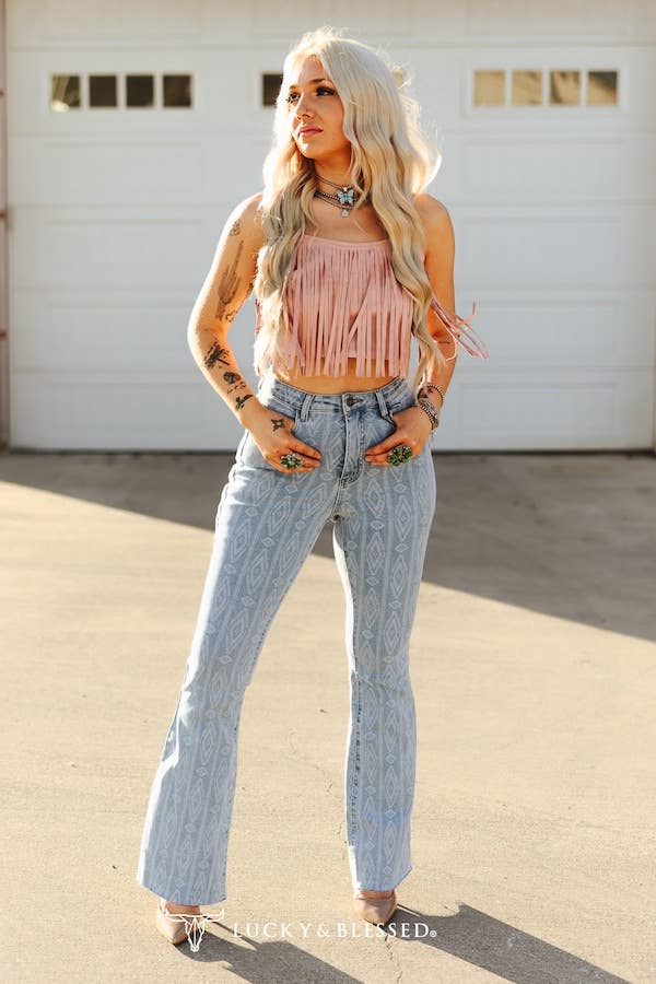 Step into bold cowgirl style with these Lucky & Blessed light wash Aztec print flare jeans, designed for the modern Western woman who loves to make a statement. Crafted from premium stretch denim, these jeans feature a subtle yet striking allover Aztec geometric pattern in soft ivory against a faded blue base. The mid-to-high rise waist offers a flattering fit, while the slim thigh and gentle flare leg create a long, lean silhouette perfect for pairing with cowboy boots or heels. Light distressing at the hem adds a touch of rugged charm, making these jeans versatile for rodeo events, concerts, and everyday Western wear. Aztec pants High Rise Tummy Control Reinforced Belt Loops Butt Shaping Gap Control Waistband Inseam: 32.5in NFR WESTERN RODEO WESTERN APPAREL