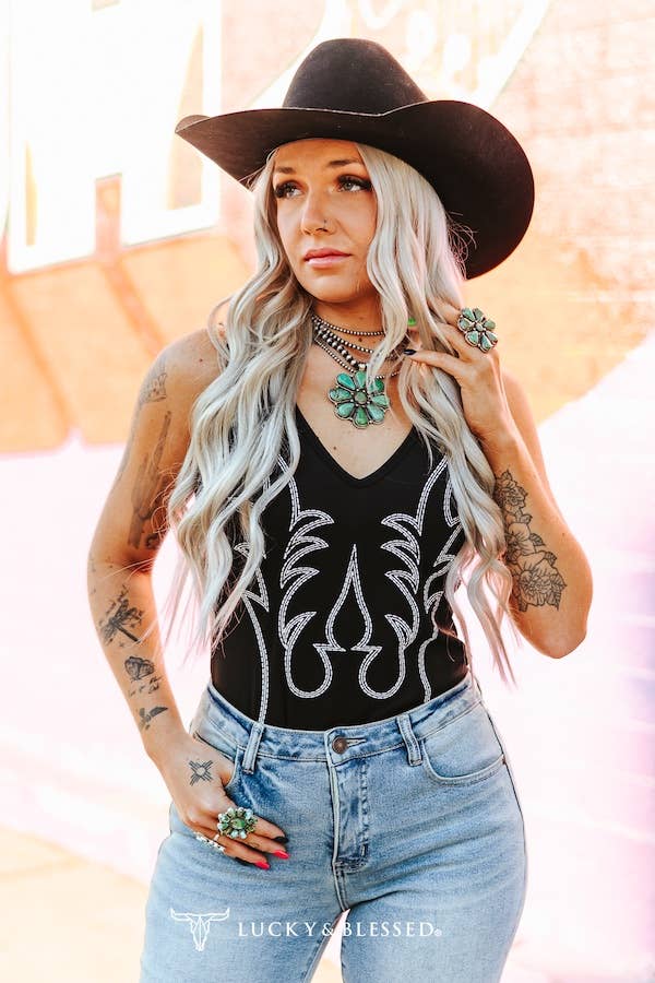 Make a bold Western statement with this Black Sleeveless Bodysuit from Lucky & Blessed – a must-have for any modern cowgirl's collection. This fitted bodysuit features intricate white Western flame-style embroidery along the front, inspired by classic boot-stitch patterns. The deep V-neck cut and sleeveless design offer a flattering silhouette perfect for layering under skirts, denim, or fringe vests. Made from a soft, stretch-knit fabric, it hugs the body while allowing comfortable movement. Finished with a snap closure for a secure fit and a clean tuck-in, it transitions effortlessly from rodeo nights to country market days. Ideal for Western boutiques and retailers looking for unique, standout bodysuits that combine fashion with frontier flair.