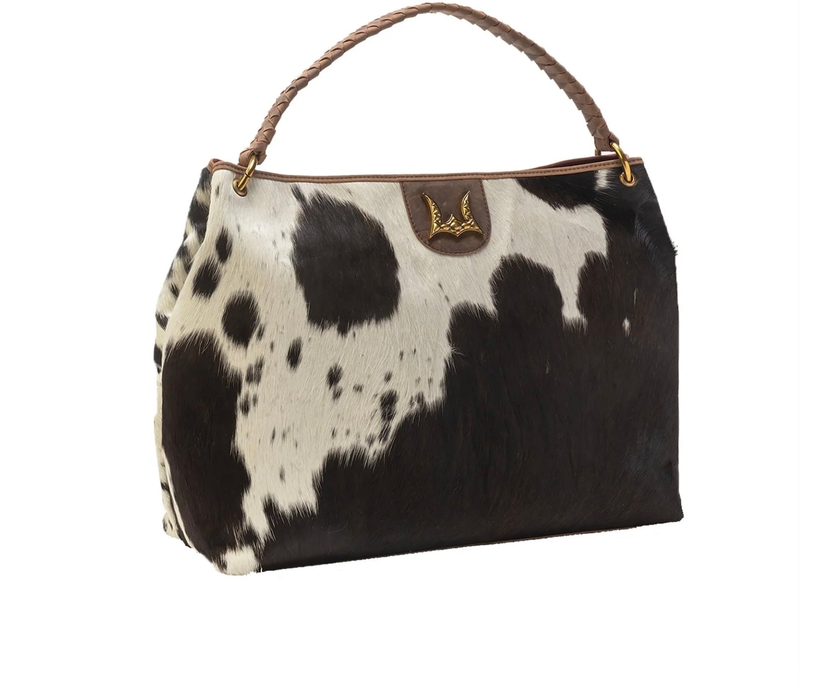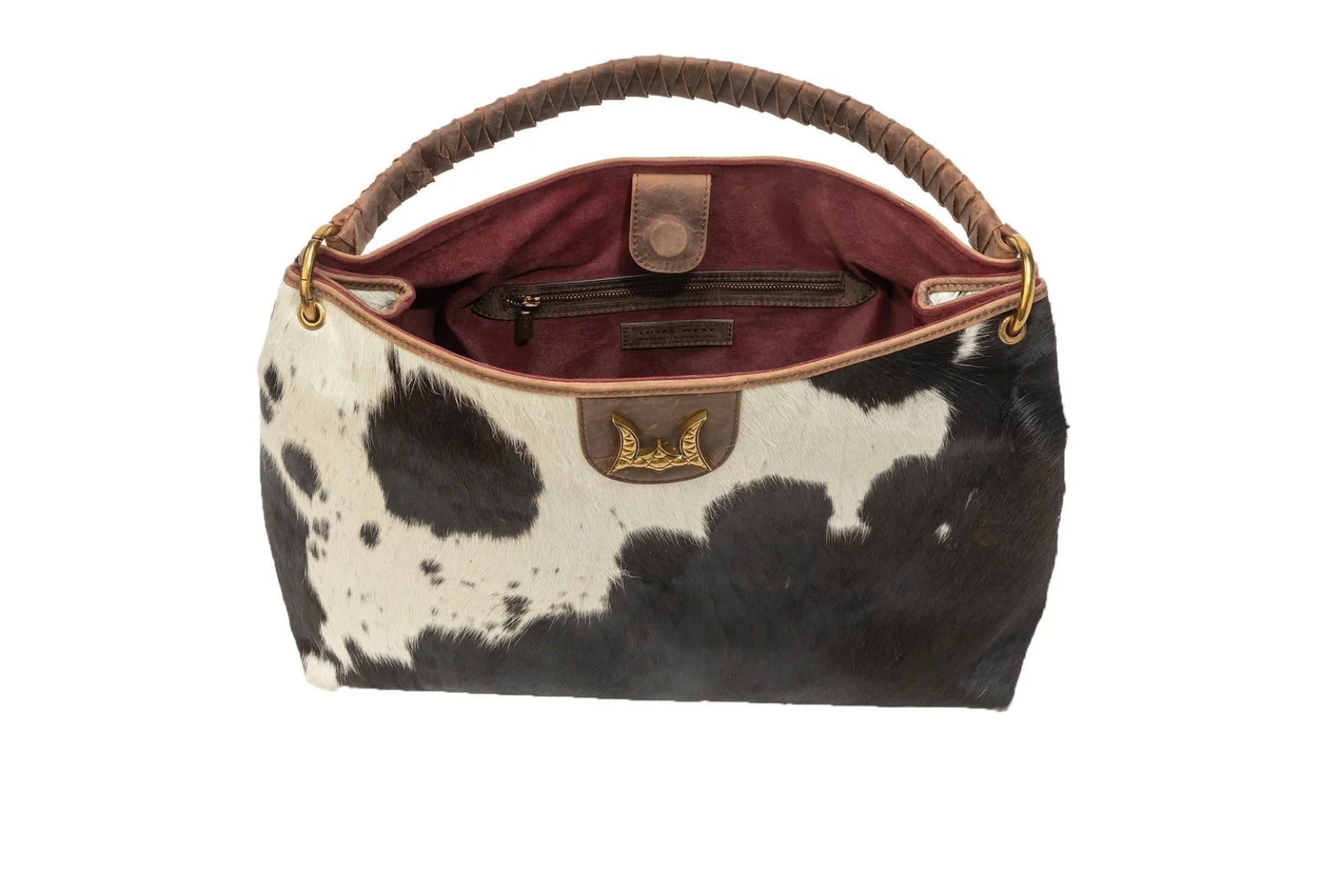 The LW Large Hobo Bag in Black & White Cowhide is a bold, modern take on classic western style. Crafted from genuine black and white cowhide, each bag features unique natural patterns—making every piece one of a kind. The supple hide offers a soft, luxurious feel while maintaining exceptional durability for everyday wear.