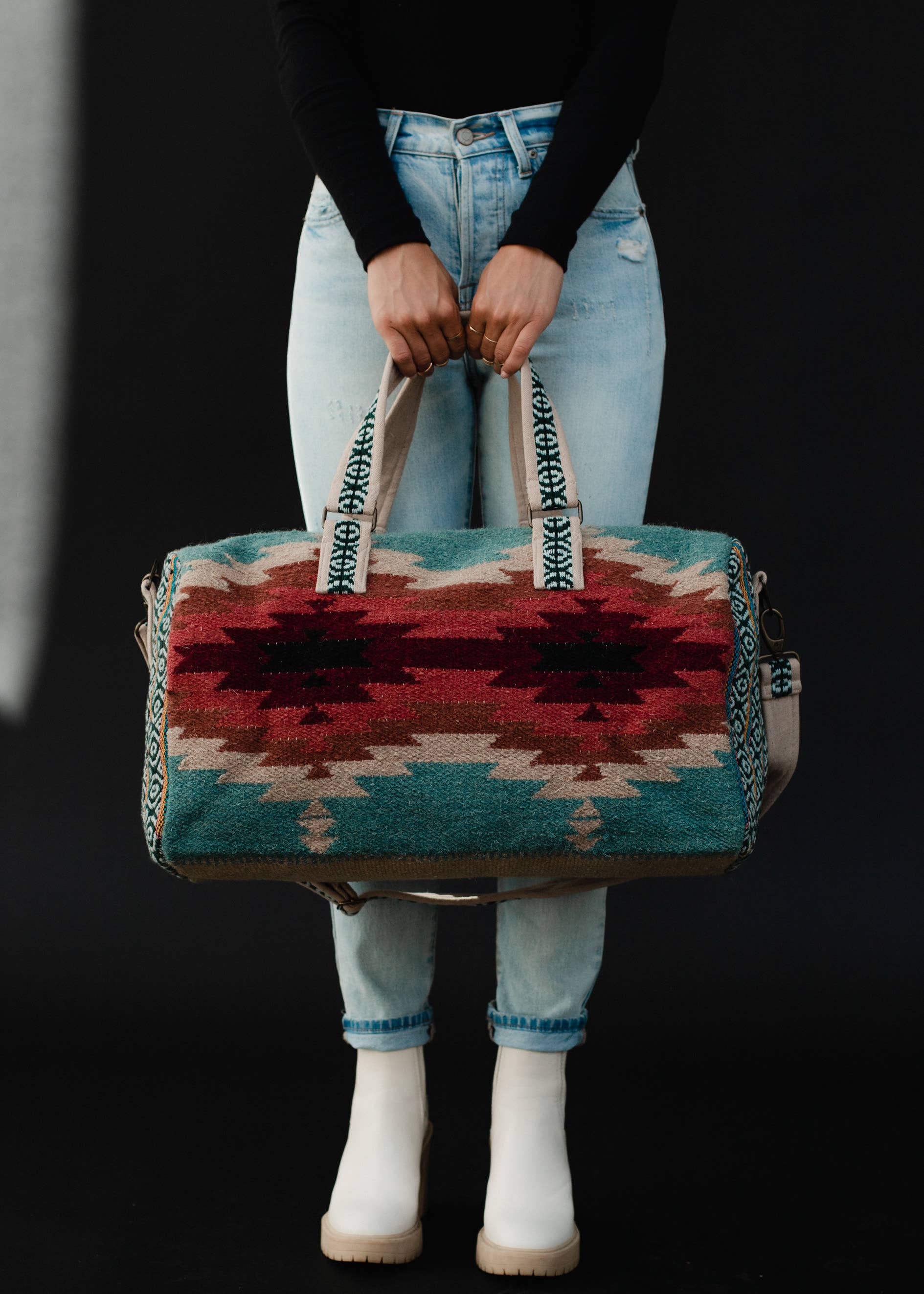 Teal, burgundy & tan Aztec duffel Zipper closure w interior zipper & 2 open pockets 20" x 11" x 8" 80% Wool / 20% Cotton Min Qty. 2