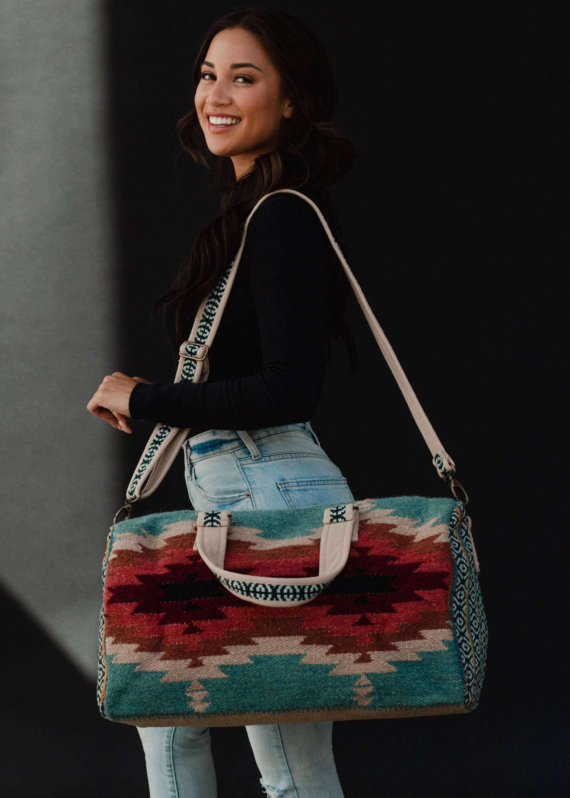 Teal, Burgundy & Tan Aztec Duffel
