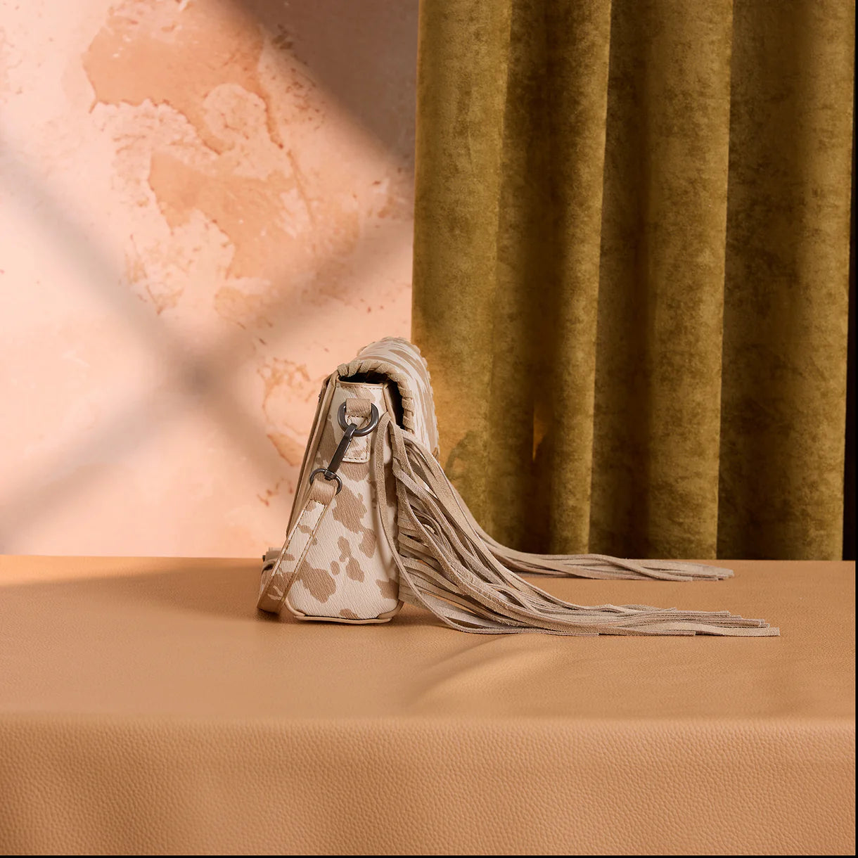 Add a fun Western flair to your outfit with this stylish Wrangler cow print crossbody bag. , This bag is accented with classic whipstitch detailing and soft suede fringe on both sides for the perfect Western-boho vibe.